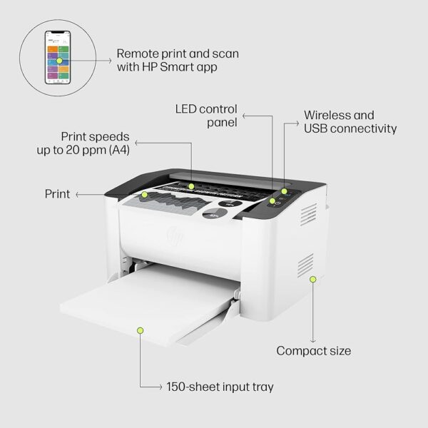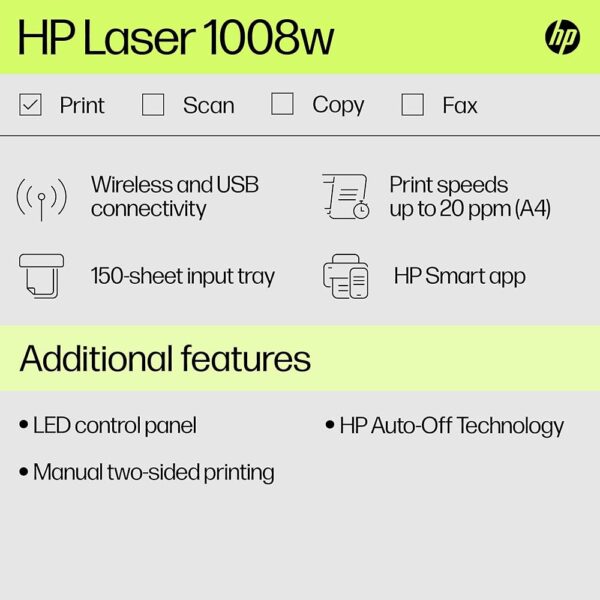 • 【Single function printer】Experience efficient printing with the HP Laser 1008w, designed to print clear, impressive documents.